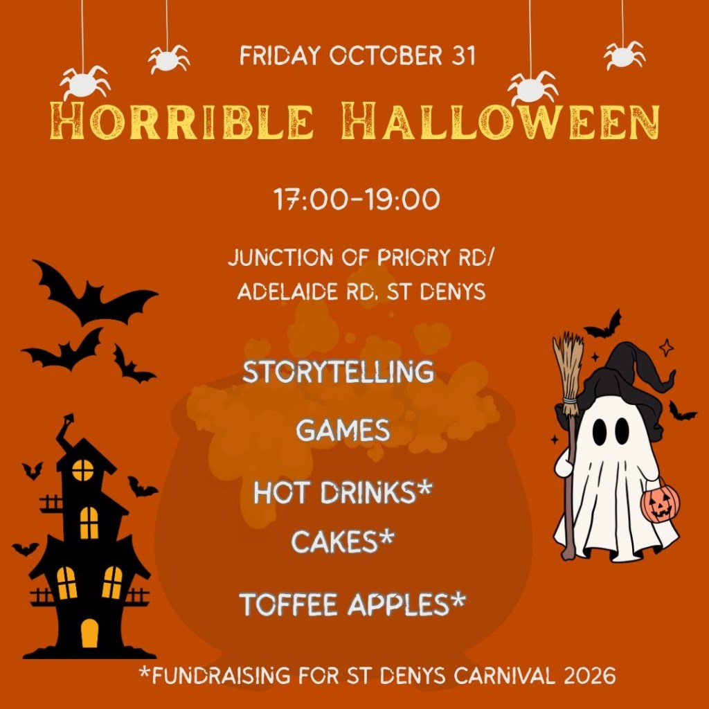 As Halloween falls on a Friday this year, we have decided to join in the fun with a pop-up event outside the Community Centre, near the junction of Priory Road and Horseshoe Bridge. Come and pop by between 5pm and 7pm on the 31st October for games & storytelling, or donate towards next year’s Carnival in return for hot drinks and toffee apples.